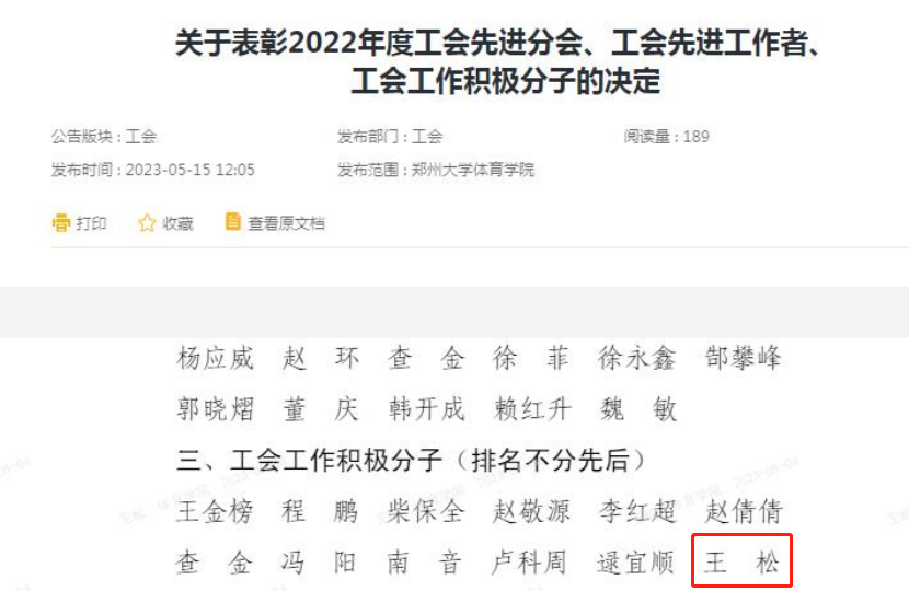 4.我单位青年教职工王松老师2022年被我院工会评为工会工作积极分子。