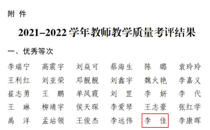 8.我单位青年教职工李佳老师在2021-2022学年教师教学质量考评中,获得“优秀”等次。