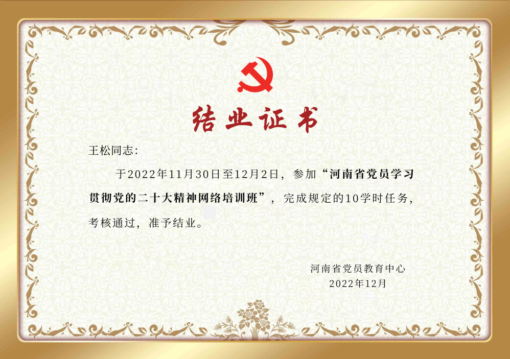 6.我单位青年教职工王松老师于2022年11月30日至12月2日,参加“河南省党员学习贯彻党的二十大精神网络培训班”,并完成考核,获得结业证书。