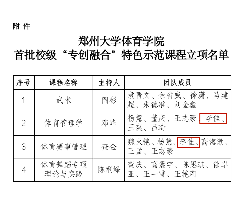 15.我单位王志豪、李佳参与首批校级“专创融合”特色示范课程《体育管理学》、《体育赛事管理》(录制课程)。