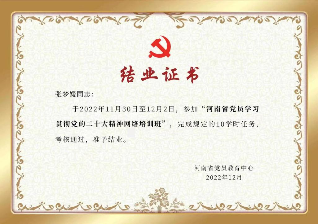 7.我单位青年教职工张梦媛老师于2022年11月30日至12月2日,参加“河南省党员学习贯彻党的二十大精神网络培训班”,并完成考核,获得结业证书。