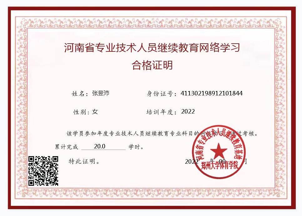 5.我单位青年教职工张昱沛老师2022年度参与河南省专业技术人员继续教育网络学习培养工程,并完成考核,获得结业证书。