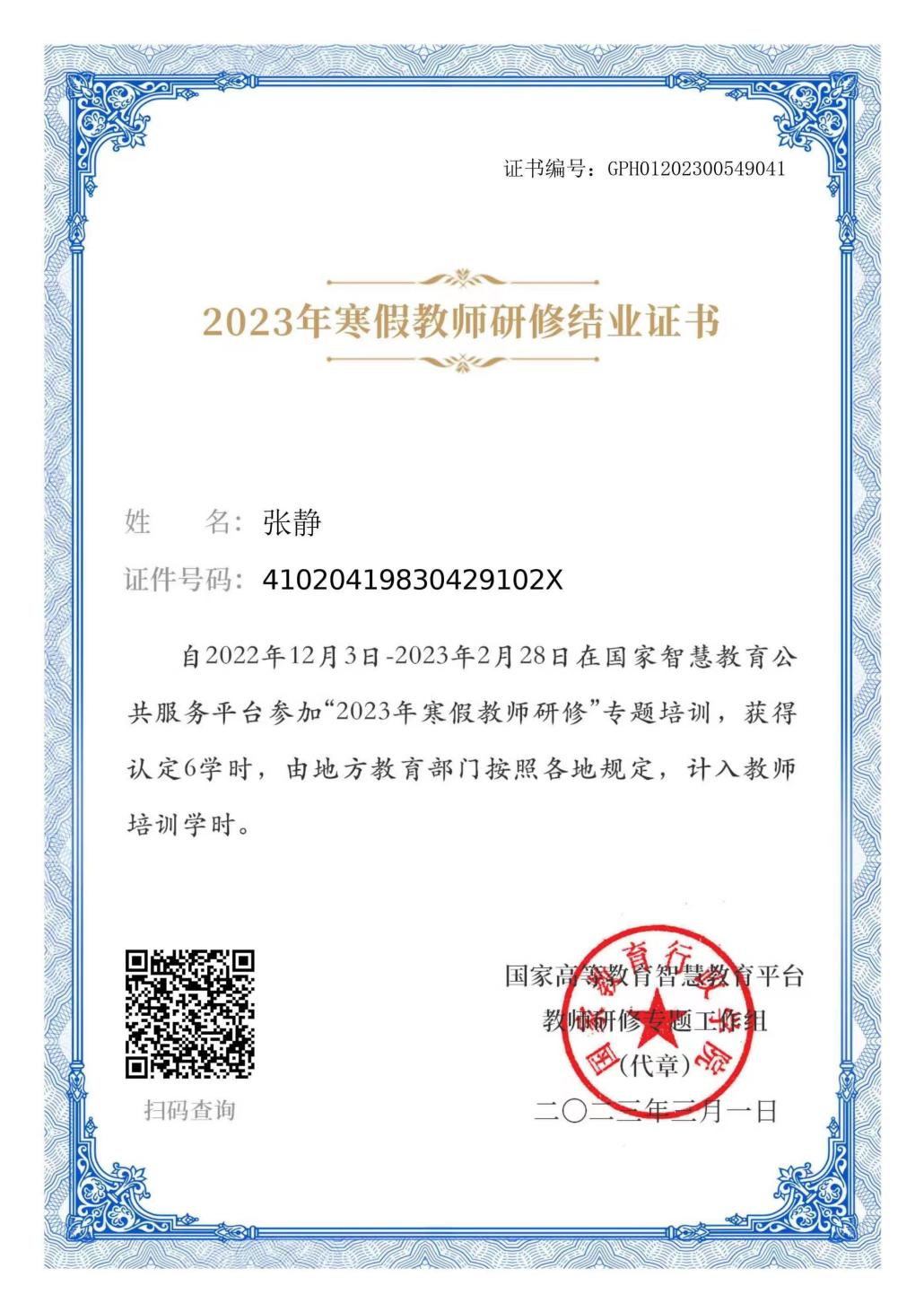 8.我单位张静老师自2022年12月3日-2023年2月28日在国家智慧教育公共服务平台参加“2023年寒假教师研修”专题培训,获得认定6学时,由地方教育部门按照各地规定,计入教师培训学时。