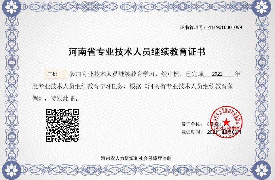 2.我单位青年教职工王松老师参与2021年河南省专业技术人员继续教育培养工程,并完成考核,获得结业证书。