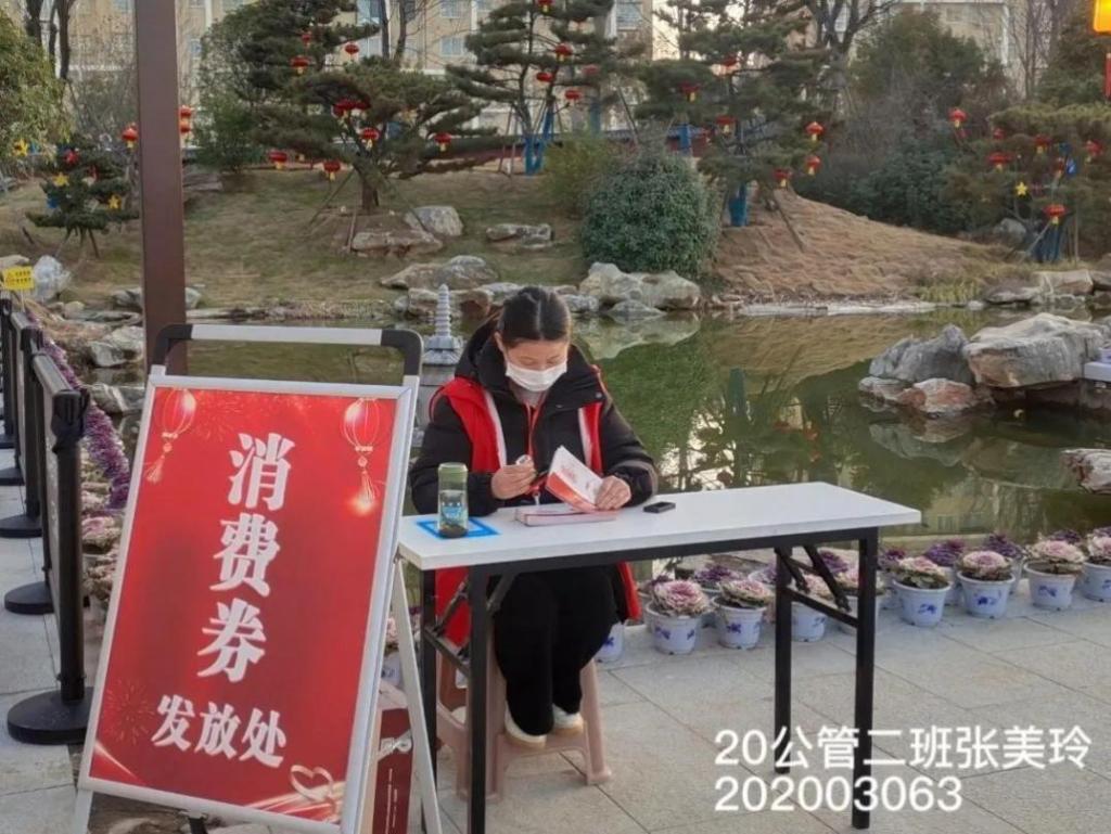 2023新春佳节,新风扑面,爱意满怀。新管系20级公管二班张美玲同学积极响应院系关于寒假志愿服务的号召,在春节期间积极投入到迎春活动的志愿服务中。