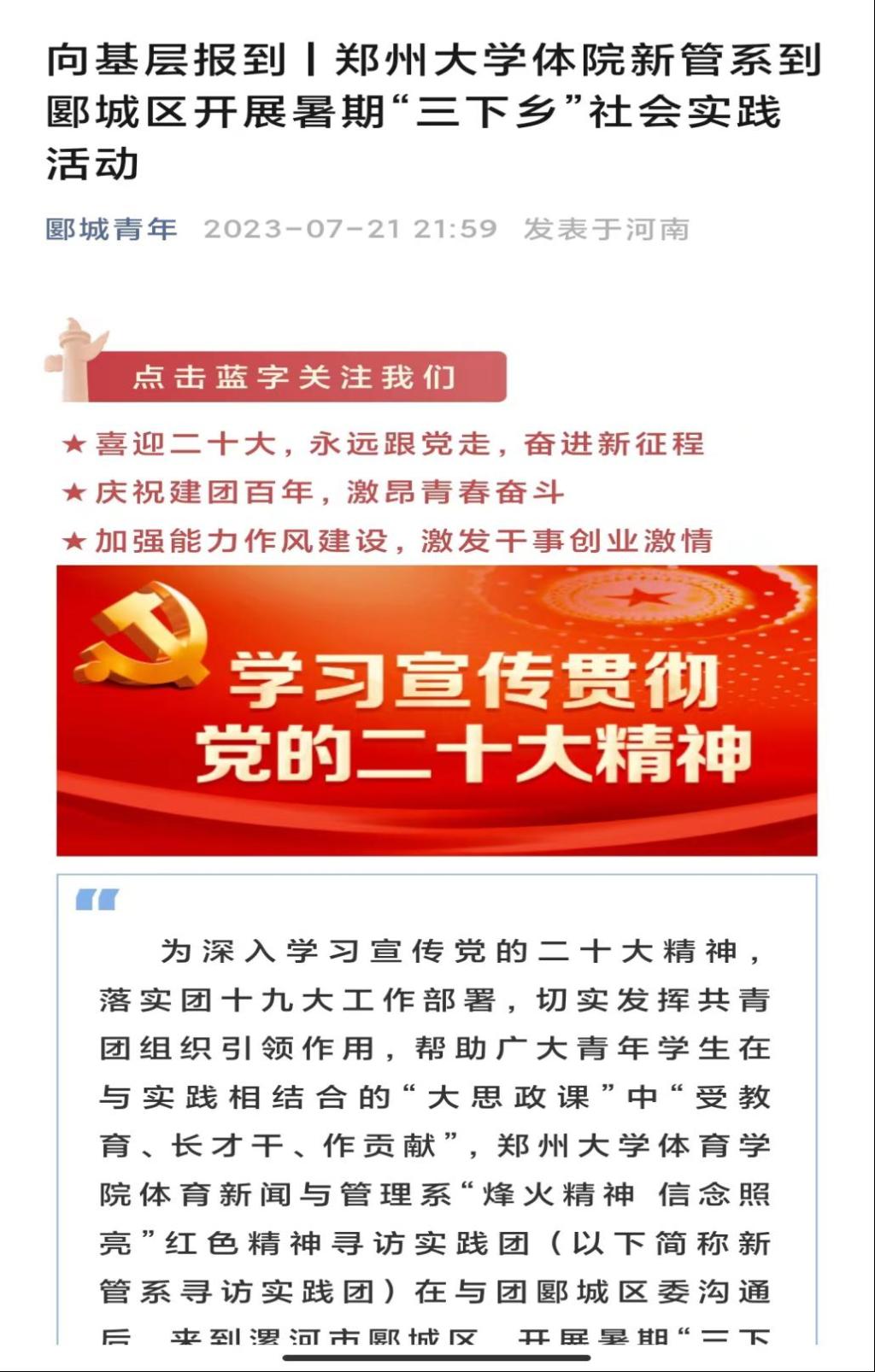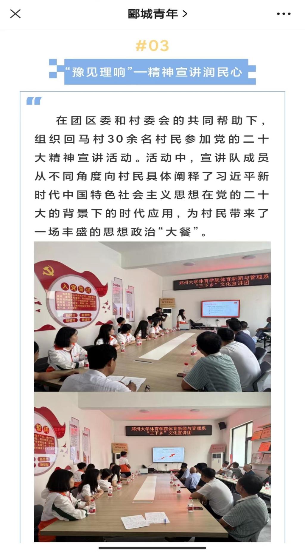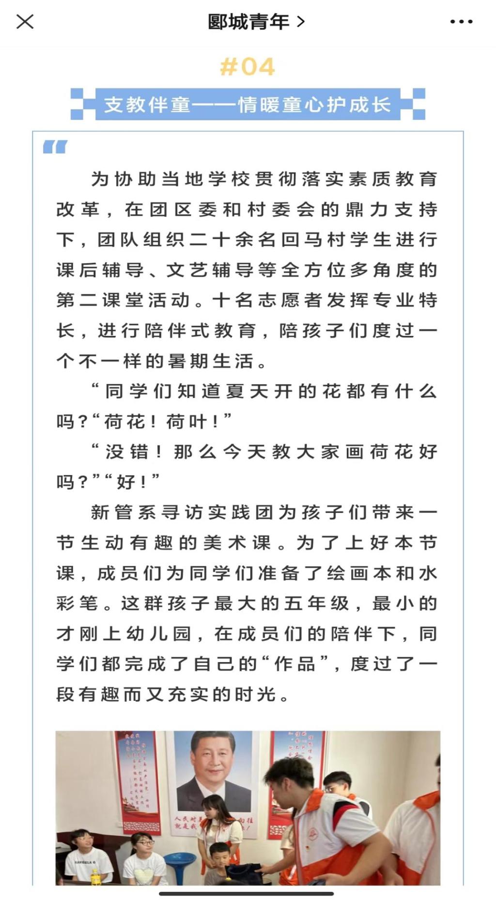 3.2023年7月,我系团总支组建的“三下乡”寻访实践团队在漯河市淞江街道回马村开展爱心帮扶、支教伴童和红色精神宣讲活动,该活动被共青团漯河市郾城区委进行了专题推送报道,我系学生代表胡栩源接受了采访。同时,也被漯河融媒进行了专题视频报道。