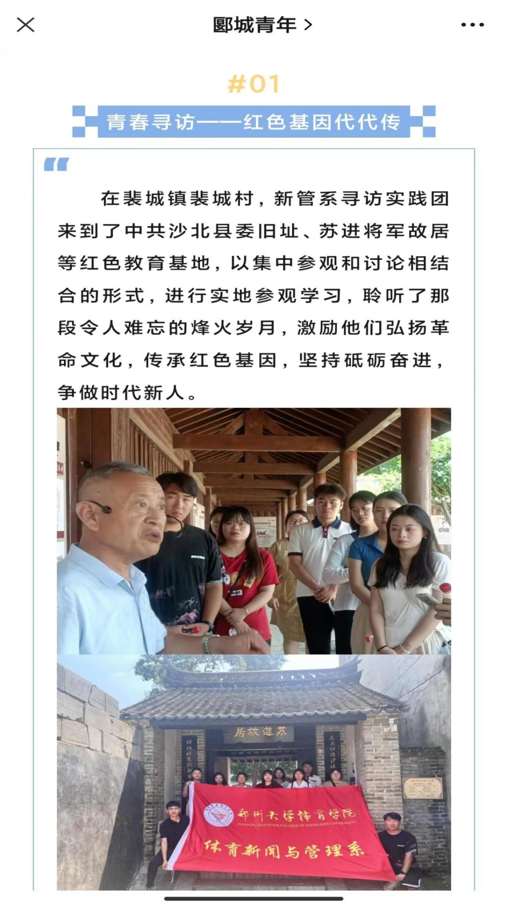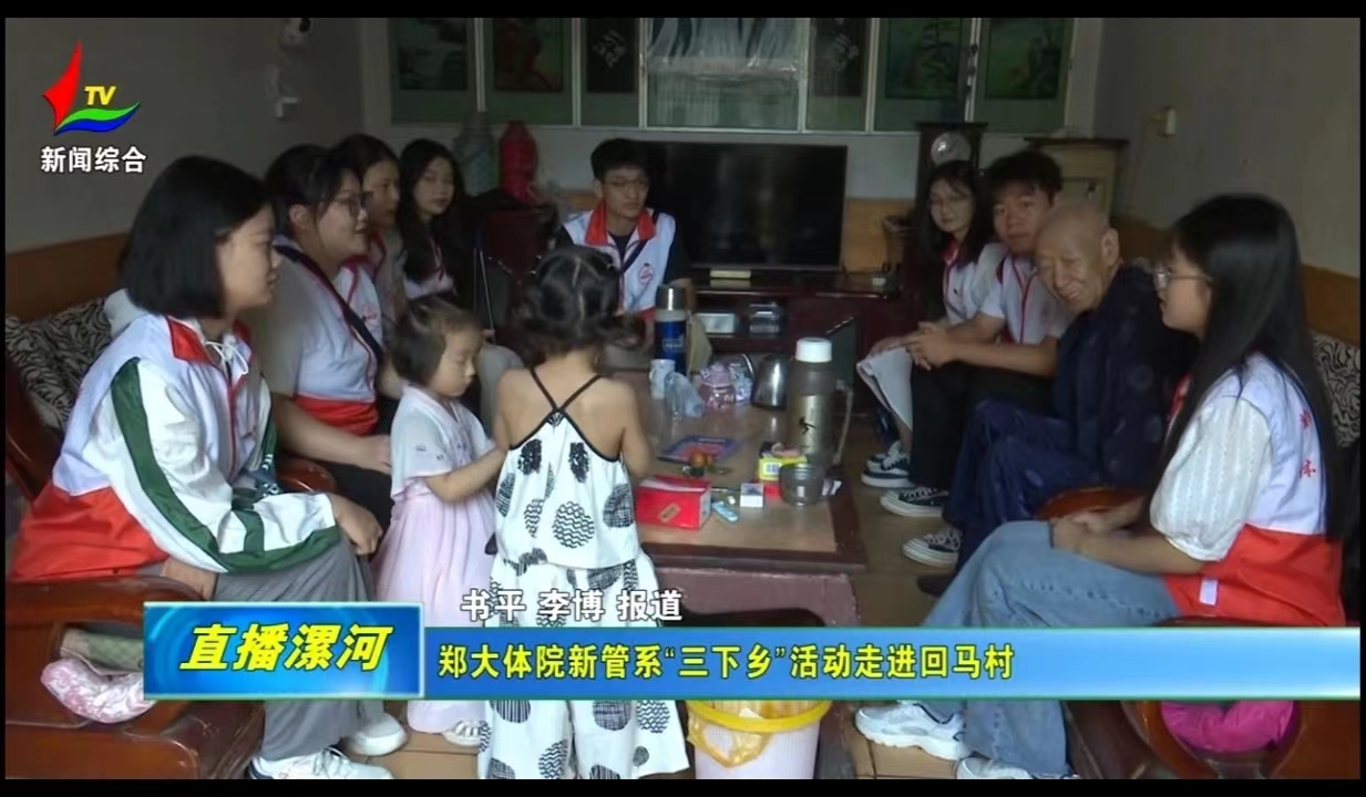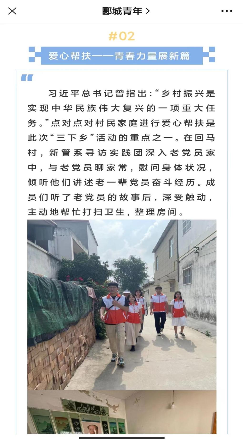 3.2023年7月,我系团总支组建的“三下乡”寻访实践团队在漯河市淞江街道回马村开展爱心帮扶、支教伴童和红色精神宣讲活动,该活动被共青团漯河市郾城区委进行了专题推送报道,我系学生代表胡栩源接受了采访。同时,也被漯河融媒进行了专题视频报道。